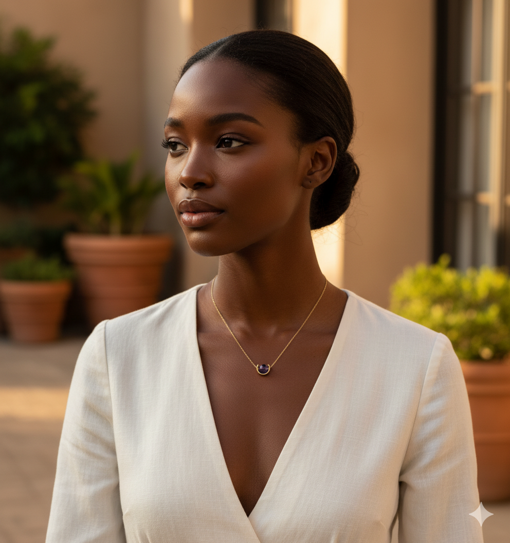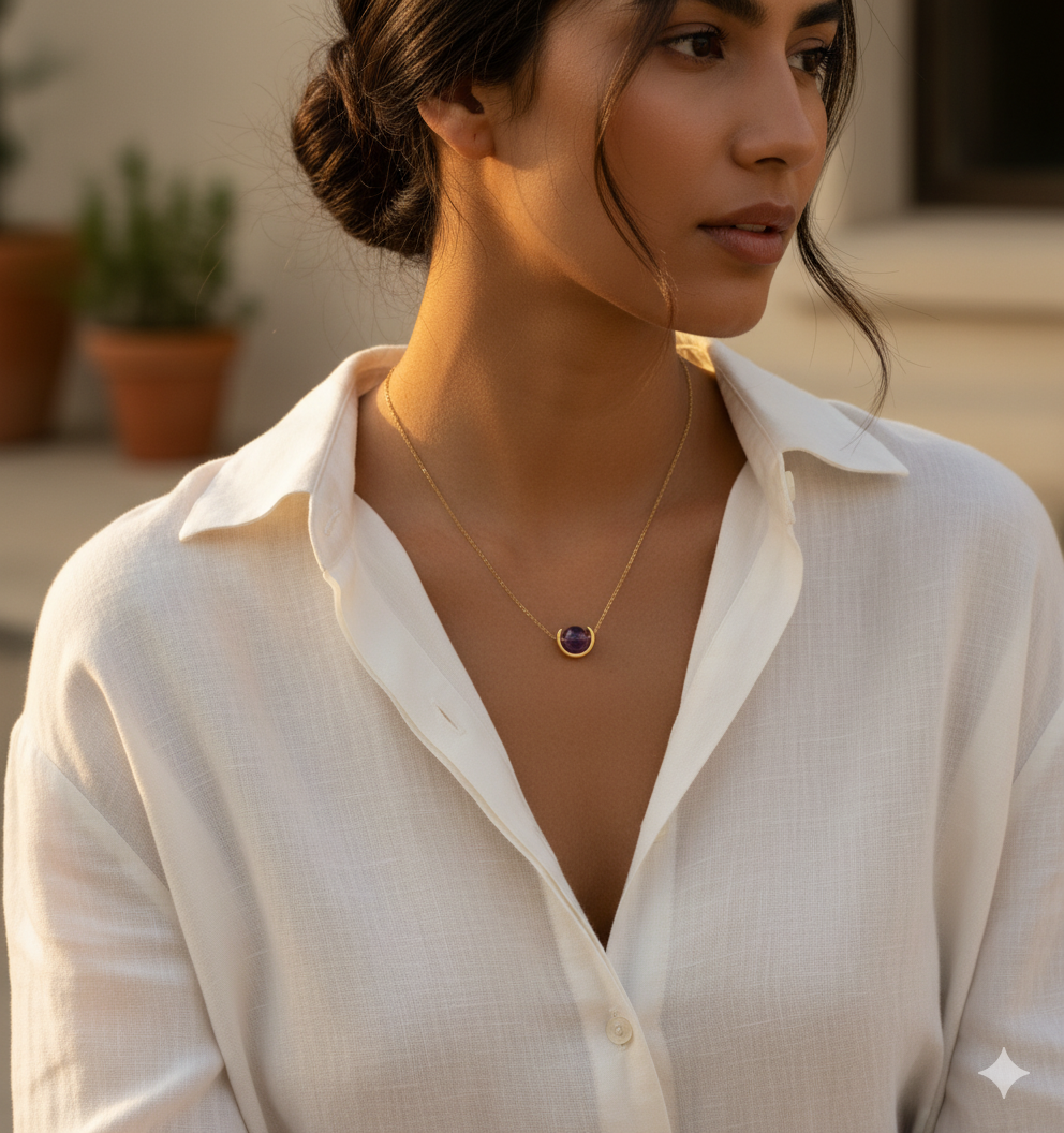 Elegant gold-plated necklace highlights a natural amethyst at its heart. Designed for women who wish to adorn themselves with beauty and meaning, this necklace becomes a modern talisman that harmonizes classic sophistication with the serene protection and clarity inspired by amethyst.